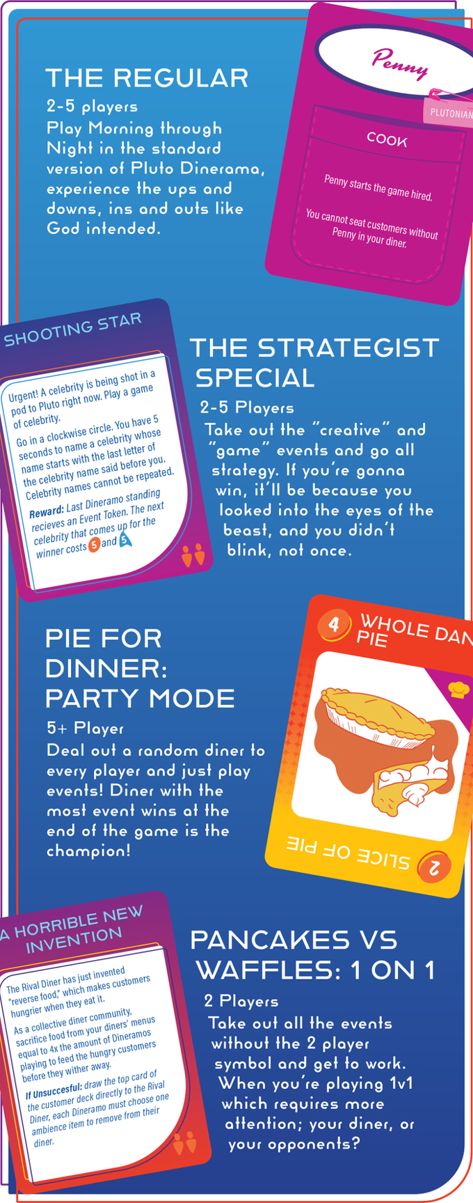 You've just opened your very own diner on podunk, wayside, last-chance-to-gas-up-before-you-leave-the-Solar-System Pluto. Now it's time to wine, dine, design, and use your "now hiring" sign to partake in the first ever collaborative/competitive, strategy-party game hyrbrid that you do not want to miss out on.